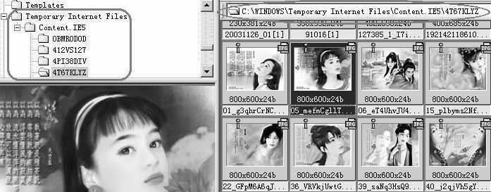 方法是:从IE属性里找到IE临时文件夹地址,运行ACDSee,打开IE的临时文件夹,如图左上所示。下方的子目录中便储存了浏览过的网页中的图片,打开任意一个目录,从“查看”菜单下选择“隐藏非图像文件”,然后以缩略图的方式浏览文件夹中的图像,以一定的方式排列图标,如图右上所示。现在,你看中了哪张图片就可以把它copy下来,怎么样,比FlashGet还方便吧。