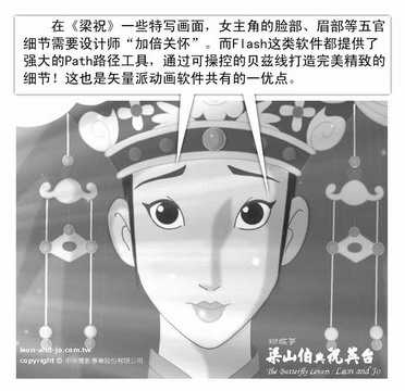 Flash软件随着功能的日益增强,已经越来越多地参与到二维动画片的制作领域中,而且由于其天然的矢量出身使得适合电影级别的高分辨输出不在话下。广泛的群众基础也培养了大量闪客人才。有观众也会提出,《梁祝》中人物的动作是丰富多彩的,Flash可以胜任吗?其实借助Flash的配套软件MOHO就是不错的解决方案,它可以建造肢体骨骼关节生成逼真动画。