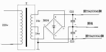 首先买一个30W双14V的变压器,一个3A的桥堆,两只4700μF/25V的电容。然后将这些零件接成一个简单的整流滤波电路(如图)。