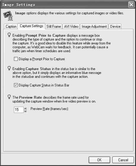 在“Capture Settings”(捕获设置)标签项下,勾选“Display Capture Status in Status Bar”(显示在状态栏)复选框,以后CoffeeCup WebCam图标将自动显示在开始菜单的任务栏中,以便快速启动该工具。