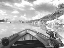 进入游戏,主角坐在一艘橡皮艇上,眼前海滨岛屿的秀丽景色立刻就把笔者吸引住了。游戏整体色调轻松明快,较《雷神之锤》等配色深而光线暗的游戏看上去更舒服。由于《孤岛惊魂》采用的是DirectX9的引擎,因此只有DirectX9的显卡能达到最好的图像效果。《孤岛惊魂》一开场主角面前那一片蔚蓝的大海就让人眼前一亮。由于水面采用了可编程像素渲染技术,因此可以将岛上的建筑、崖壁还有树木的倒影真实地反映出来;在阳光的照耀下,水面波光粼粼的效果几可乱真,海浪的层次感也非常明显,海滩上水浅的地方几乎可看到水下沙粒在滚动。