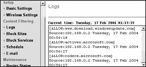 为了禁止用户访问敏感信息或网站,WGR614也提供了关键词/网址的屏蔽功能,如果这还不够,我们可以通过“Block Services”功能直接禁止某一类型的服务。利用“Logs”(日志)功能(见图),我们还可以对连接设备访问的网站进行监控。即使用不着无线功能,我们也可以把WGR614当作一个有线宽带路由器来使用(它自带了4个100Mbps RJ-45 LAN口)。如果说惟一的遗憾,就是它没有集成打印服务器功能了。如果网络环境中的打印机不是具备独立IP地址的网络打印机,那就还是需要一台电脑当做打印服务器一直开启。