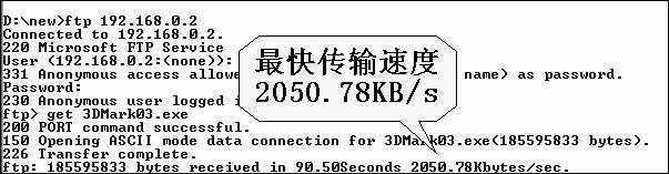 我们用双绞线将有线平台分别与WGR614和WG602连接,然后用华硕M6N笔记本电脑自带的802.11b无线网卡和WG511 802.11g无线网卡分别连接基站,进行命令提示符下的FTP文件传输,以测试最大无线传输速度。通过数据表格我们可以看到,在无线信号强度和连接质量都在100%(即最佳状态)时,该802.11g网络的最大传输速度为2050.78KB/s(见图),即16Mbps多一点,距20Mbps还有一段距离,但考虑到室内反射干扰、手机信号干扰较重,而且存在其他无线网络信号,所以这一速度已十分理想。而当信号强度和连接质量降低到86%时,无线传输速度也保持得相当好,能达到1759.67KB/s。而且,我们还欣喜地发现,在使用802.11g基站时,即使是802.11b 11Mbps连接的实际传输速度也大大提升,达到了717.53KB/s,相对纯粹的802.11b网络环境下620KB/s左右的平均传输速度有较大提升。