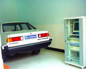 一个20多平方米的房间内,一辆白色的普通桑塔纳轿车停在房间中,车前方的墙上有一个大屏幕,车的前轮下是一对滚轴,车后摆放着一台电脑,电脑上方还有一台小型投影仪正对屏幕。