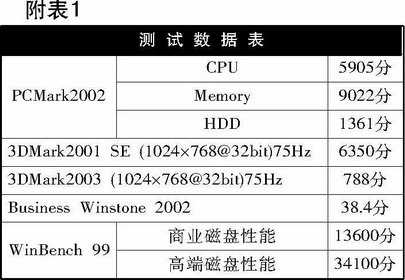 在显卡3D图形表现能力方面,笔者使用了3DMark2001SE、3DMark2003软件进行测试。由于GeForce FX5200只有4条渲染通道,图形处理能力显得稍弱;但借助其128MB大容量显存,应付一般的家庭应用还是绰绰有余。新梦2880E使用三星7200转/分(ATA100)的IDE硬盘,具有2MB缓存,在WinBench 99磁盘子系统性能测试中,商业磁盘性能和高端磁盘性能分别取得了13600分和34100分(详细测试结果见附表1)。