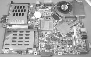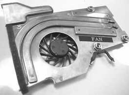 图3是一款知名品牌笔记本电脑的主板,在该主板上可以看到CPU的散热器。在一些知名品牌笔记本电脑中,CPU风扇可以说是整台笔记本电脑中惟一的风扇,这些散热器采用了良好的散热材料,出色的导热设计,充分考虑到机身内部的空气流动,并且有智能管理系统,可以随温度变化而智能地控制风扇的转速。一些低价笔记本电脑采用的都是体积比较大的风扇(图4),而且连主板的大小和布局都是一样的,以保证配件的通用性,降低成本。