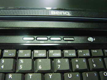 JOYBOOK6000采用了一键开屏的设计,按下面板正中央的按钮,屏幕就可轻轻用指姆开启。打开屏幕,可以看到整个本本的设计格局可说是方方正正,包括触摸板以及下边的两个快捷键也都是方正的。黑色键盘显得很沉稳,敲击感觉到弹性十足,键距较为合理;不足之处是几乎所有的个键呈长方形,这对用惯了传统键盘的人来说不是很习惯。键盘的正上方分别有四个快捷键(图1),可以帮助用户方便的开启浏览器和Outlook等程序;快捷键的右侧是电源开关,指姆尖大小煞是乖巧。