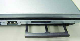 笔记本电脑的扩展功能同样重要,看看机身的左侧:一个IEEE 1394、一个USB2.0、一个PCMCIA扩展槽和一个SD、MMC和Memory Stick的三合一读卡器(图2);右侧:麦克风、耳机接口,一个USB2.0和RJ-45网络接口,另外还有一个无线网络的开关;后侧:VGA接口、电源接口以及MODEM接口;值得赞许的是:部分接口外部都设计了一个活动的小盖,可起到保护和防尘的左右,对延长这些接口的寿命是有好处的。