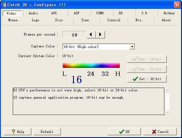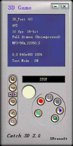 运行Catch 3D之后首先会看见图1所示的主界面,其中窗口上部是当前软件的设置属性,窗口左下边有一列用于设置截取属性的按钮,而右下部则是录制影像的控制按钮。为了能够获得最佳的截取效果,建议大家先点击“Set configure”按钮进行相关的设置。