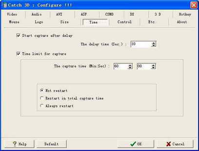 通常我们都是先运行Catch 3D,然后才运行游戏软件,这两者之间有一个时间差。在“Time”标签下选取“Start capture after delay”一项,并且在“The delay time”对话框中输入一个数值,这样就可以让Catch 3D运行之后延迟一段时间才开始真正录制(图3)。另外勾选了“Time limit for capture”后,则设定的截取时间到达后,Catch 3D将自动停止影像录制。