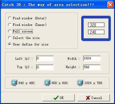 1.在Catch 3D主窗口中点击“Ser area”按钮,并且在图4所示的窗口中设定截取画面的大小。可根据游戏窗口来选取全屏、640×480、800×600以及1024×768等窗口大小,甚至还能够自行设定截取窗口的位置。