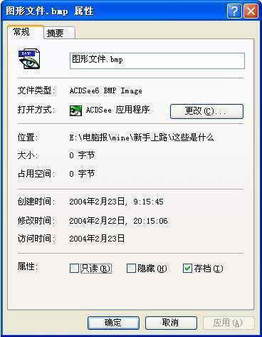 正常情况下,文件和文件夹有三种可选属性:存档、隐藏和只读。我们用鼠标右键点击某个文件,选择菜单中的“属性”,这里可以看到这三种属性是可以选择的(图6):