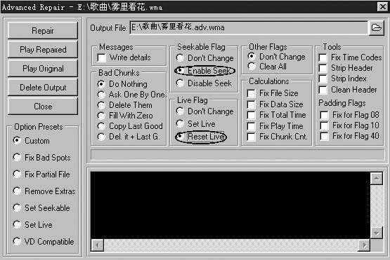 先将受损的WMA文件添加进来,在软件左侧操作界面展开“Repair”,选择“Advanced Repair”,打开“高级修复”对话框,如图2。将Seekable Flag设置为Enable Seek,Live Flag设为Reset Live,点击“Repair”进行修复,再点击“Play Repaired”播放,怎么样,是不是可以拖动播放了?