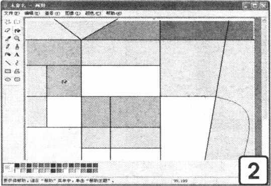 右击作为边界的矩形,在“对象属性”中设置填充底色为黄色、边线颜色为白色。选中全部对象,然后把它们复制到画图程序中,利用画图程序中的“用颜色填充”工具在各个区域内填上相应的颜色(图2)。