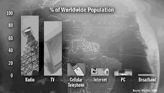 不过在贝瑞特的演讲中,他演示了下面这幅图片:各种产品的世界人均占有率。从中可以看到,广播和电视已完全大众化了,而手机、因特网、PC和宽带却才刚刚起步。Intel认为,虽然经过了数十年的高速发展,PC产品和市场日渐增长,但PC产业相对于广播、电视等行业,仍然处于幼年,还有着相当大的发展空间。