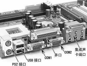 转到主板的侧面,就能看到主板的外部接口了,例如用来连接鼠标、键盘的PS/2接口。 PS/2接口共有两个,圆口,靠近PCB基板的那个紫色接口一般用来接键盘,上边的绿色接口用来接鼠标。USB接口是现在最流行的外设接口。现在的串行接口使用频率不高了,多用来连接外置Modem及手写板等设置。并行接口一般用来连接打印机,由于目前的主流打印机都开始采用USB接口,并行接口基本已经“下岗”了。现在的主板大多集成了声卡,因此我们还能看到集成声卡的输入/输出端口(图5)。
