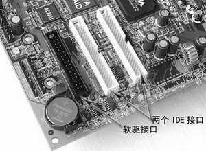 目前市场上的硬盘基本上都采用IDE接口,因此在主板上都能找到两个IDE接口及一个软驱(FDC)接口,现在的这些接口往往还被厂商涂上艳丽的颜色,所以能轻松找到它们。