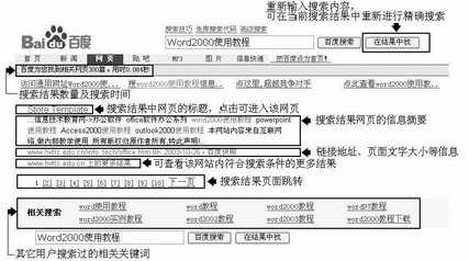 2.在搜索框内输入想要搜索的内容,只要输入关键词,搜索引擎就会寻找所有符合你查询条件的资料,并把最相关的网站或资料排在前列。例如你想学习Word2000的使用方法,输入关键词“Word2000使用教程”,按下“百度搜索”按钮,就会弹出搜索结果,如图2所示。