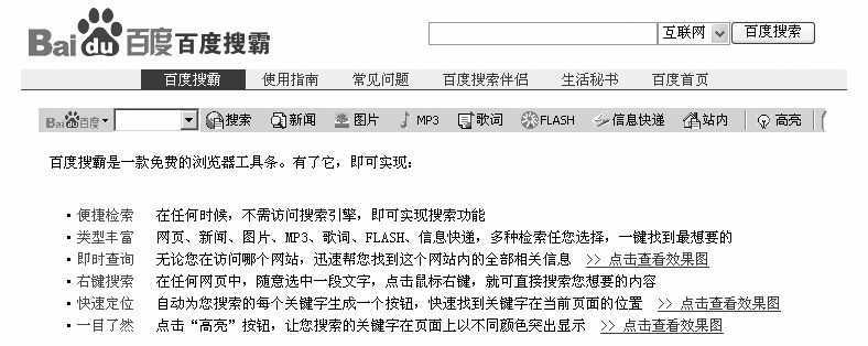 常用Baidu,需要在IE中输入网址选择搜索项目等操作,显得繁琐复杂。试试“百度搜霸”吧。点击Baidu首页的 “搜索工具”,进入如图4所示的页面,该页面中对“百度搜霸”进行了简单的功能介绍。点击上方的“使用指南”可以在弹出的页面中获得软件的使用方法。