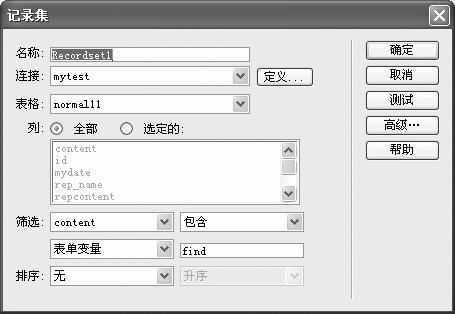 新建一个记录集。因为我们所要查找的是主题内容,所以在记录集中将条件“筛选”选择为“Content”这个字段,“包含”传递过来的表单变量“find”,而find变量就是find.asp里文本域的名字(图4)。在新建的页面中插入一个表单,在表单中建立内容,将记录集的数据与内容进行绑定。这样就完成了disp.asp的制作。