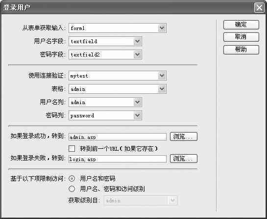 由于不希望管理权限的页面被别人通过某些特定的方式打开,所以必须给它们都加上页面保护功能。依次打开“服务器行为→+→用户身份验证→限制对页的访问”,在对话框中进行相应的选择,按“确定”后就可以实现页面保护功能了。
