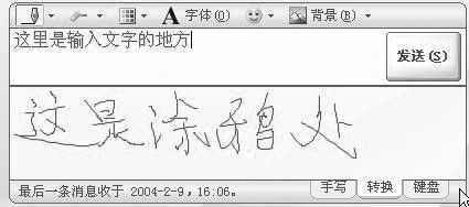 2.登录到MSN Mesenger中,开始和联系人交谈,你将会看到在信息书写窗口中多出几个选项,这在MSN Messenger 6.0和6.1中稍有区别,在6.1中的如图1,在6.0中则是将手写和键盘的切换按钮放到了书写窗口的左上角。