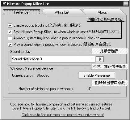 网上有众多的弹出窗口拦截工具可供我们选择,这里介绍的HPK Lite 3具有拦截率高、智能、免费、易用的特点。安装并运行后,HPK Lite 3显示在系统托盘区,从右键菜单中可直接进行控制,通过Prefrences菜单项进行选项设置(图1),对于允许弹出窗口的站点可将其URL加入到白名单中(WhiteList)。