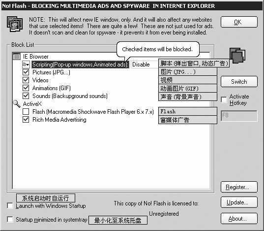 No!Flash是一款免费的多媒体广告拦截工具,用来对脚本、图片、视频、动画图片、声音进行允许/禁止操作。安装后同时在托盘区显示一个图标,从右键菜单中选择Show Main Window,打开设置窗口(图2),在Block List里选中为禁止,取消为允许。设置完后点OK按钮生效,双击图标或点Switch可禁止或允许No!Flash工作,禁止No!Flash时会自动还原浏览器选项设置。