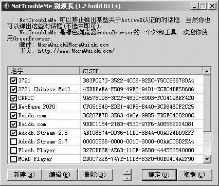 它的作用是阻止加载ActiveX提示框。下载安装包并解压至一个目录,运行NotTroubleMe.exe即可。它可阻止常见的网上插件的安装,当然,如果你想安装部分插件,也可以在列表中进行选择,取消对你需要的插件的屏蔽。在NotTroubleMe中还可以加入新的ActiveX控件/插件进行屏蔽,只要知道其在注册表中的CLSID即可。