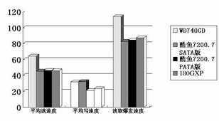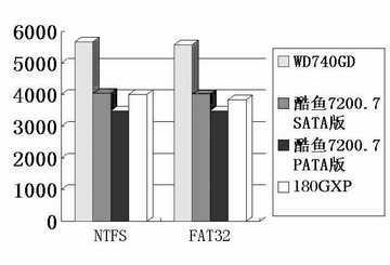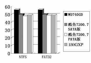 无论是在NTFS格式下,还是在FAT32格式下,WD740GD在PCMark04中的得分都超过了5500分,远远领先于其他各款硬盘。而在NTFS格式下,更是达到了5664分,超过了希捷酷鱼7200.7 SATA版1627分,是它的1.4倍;比得分最低的希捷酷鱼7200.7 PATA版高出了2175分,是它的1.6倍(见数据表)。通过子项目,我们能够更为明显地看到酷鱼7200.7 PATA版与WD740GD的差距!