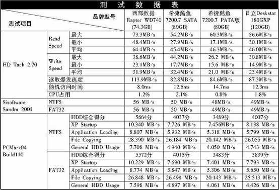测试软件:HD Tach 2.70、PCMark04 Build110、Sisoftware Sandra 2004