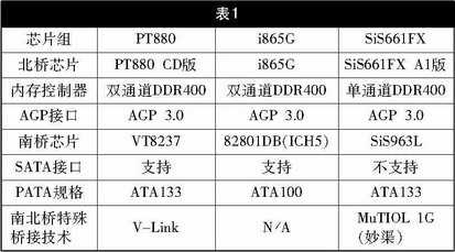 SiS661FX可以说是SiS650的升级版本,提供了对800MHz FSB和DDR400、AGP 8×的支持,同时也集成了显示单元,可以从内存中划分最大64MB的显存。此外,SiS661FX搭配的也是大家熟悉的SiS963L/964L,在这里就不再详细介绍了(PT880、i865G、SiS661FX详细规格见表1)。