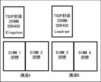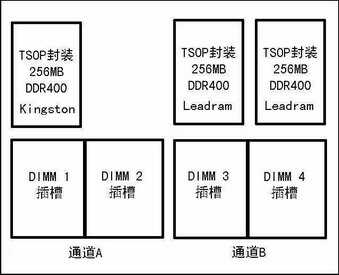 我们选择了256MB的CSP封装和TSOP封装的DDR400内存各一条分别插在通道A和通道B对应的插槽中。测试结果是,系统完全无法启动。