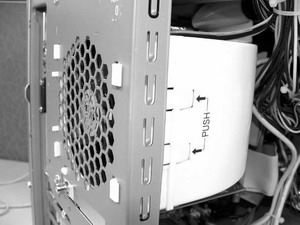 机箱采用了紧密设计,机身比一般的机箱要短小,这有效地减少了桌面占用空间。值得一提的是机箱内部除了正常的散热设备外,还特别添加了一个机箱风扇,并直接用抽风管道连接在CPU风扇的上方,给处理器提供了良好的散热支持。机箱前面板上还设计了前置S-Video、USB2.0、音频视频输入/输出、IEEE1394接口以及七合一读卡器,更方便了数码设备和办公外设的接驳与传输。