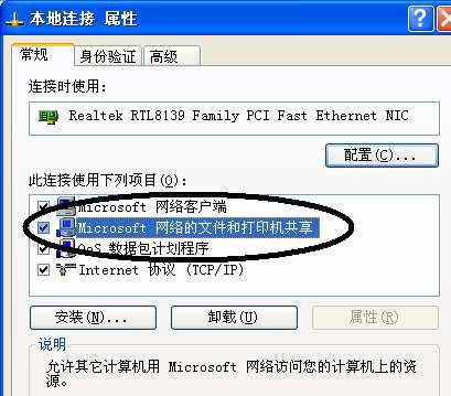 从“控制面板→网络连接”中打开图1所示的“本地连接属性”窗口,检查相关计算机上是否已安装了“Microsoft 网络的文件与打印机共享服务”,这里应该已被激活。如果没有找到这一项的话,请点击“安装”按钮进入下一窗口,选择“服务”项,然后点击“添加”按钮,找到“Microsoft网络的文件与打印机共享服务”项,并点击“确定”按钮即可将它添加到系统中。
