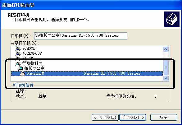 校长办公室新添置了一台三星ML-1510黑白激光打印机,打印质量和速度自然比以前的喷墨打印机有了很大的改善,因此很多老师打印文稿时都跑到校长办公室来,弄得办公室主任不胜其烦,因为一方面进进出出办公室的人员很多,另一方面大家传输文件时也存在病毒侵入的危险,他问我是否可以让打印机共享,这样老师们打印时就不用亲自跑过来了。