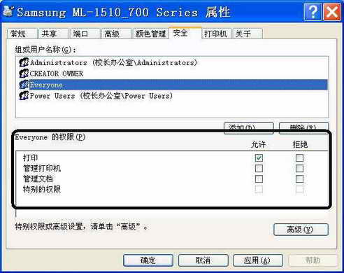 打印机激活共享后,缺省设置下所有用户均有权限访问,如果希望为不同用户设置不同级别的访问权限,可以通过“安全”标签页进行设置。如图4所示,在这里可以添加允许访问共享打印机的组或用户,并且还可以为之分别设置不同的访问权限,一般情况下只需给予“打印”权限即可,至于管理打印机、管理文档、特别的权限等一概取消。