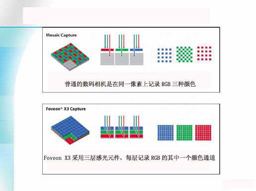 再来看看适马的Foveon X3三层CMOS技术:一般采用CCD或者CMOS的数码相机是在同一像素上记录RGB三种颜色,而Foveon X3采用三层感光元件,每层记录RGB的其中一个颜色通道,同样的三原色,每个原色采用三个像素记录当然会比采用单个像素记录效果要好。