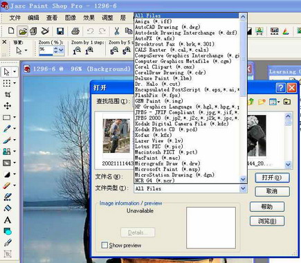 在对图形格式支持上,Paint Shop Pro 8支持多达50多种文件格式(图1),可以直接打开CDR格式的矢量图形,对矢量图形的支持Paint Shop Pro 8要强很多。而Photoshop只支持20种格式,对矢量格式要经过转换才能处理(对矢量格式处理,Adobe公司有专业的软件──Illustrator)。从宏观上我们无法辨别它们的优势,还是让它们各显身手吧(注:以下均以Photoshop 7.0以上版本为准)!
