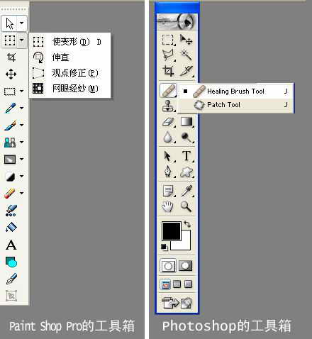 在设计软件中工具箱是最重要的,就如同习武之人的兵器。如果不算工具箱中的拓展工具,Paint Shop Pro 8共19种“兵器”,Photoshop则有22种“兵器”(图2)。对这里面的“兵器”,我们不能说谁的“兵器”越多谁就越强,这些工具足能应付我们平常的设计。由于涉及的工具太多,这里我们只针对各自最有特色的几个工具稍作介绍。