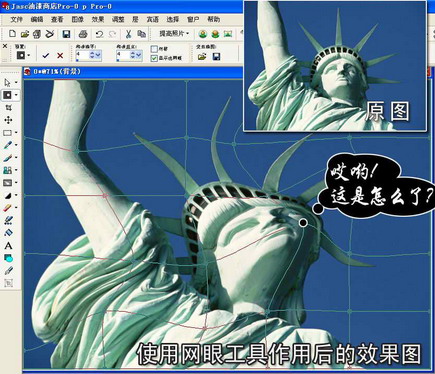 选择变形工具的网眼工具,接着在出现的网格上随意拖动,你会发现画面跟着做有趣的变化(图3),而且变形后的效果非常自然,对图片质量也没有损伤,这对喜欢搞变形效果的人很有用。