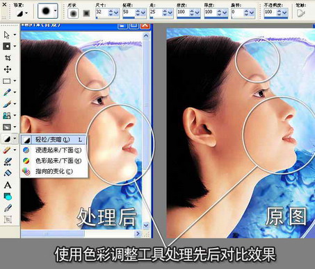 除了网眼调整工具外,Paint Shop Pro 8中还有色彩画笔和艺术画笔工具,也很有特色,其中色彩画笔可以处理图片的色彩以及明暗效果(图4),这对调整图片色彩效果非常有帮助。