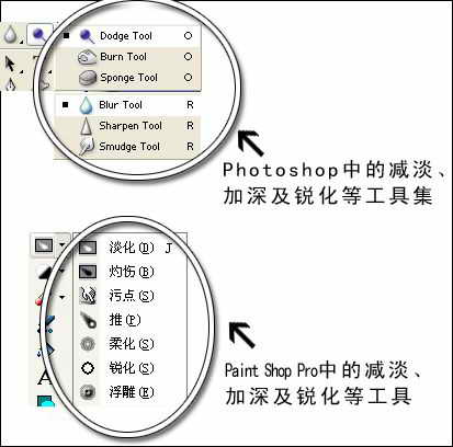 在图5的工具对比中,我们会发现,两者类似的工具还有很多。它们在效果上有一些差别,但都基本相同。在这里Paint Shop Pro 8多了一个浮雕工具,可以做一些浮雕效果。我们不敢说谁参照了谁,只能说英雄所见略同。