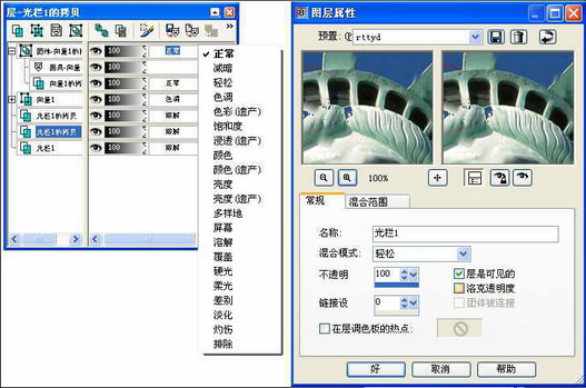 现在很多图像处理软件都具有图层功能,Paint Shop Pro 8也不示弱,从图6中我们可以看出,Paint Shop Pro 8的图层也吸收了Photoshop中的图层模式和图层效果设置的特点。很多功能都集中在图层属性控制面板中,在图层控制面板中你还可以直观地看到添加效果前后的对比。其中最有特色的是在Paint Shop Pro 8中,图层色彩调整功能体现得很强。