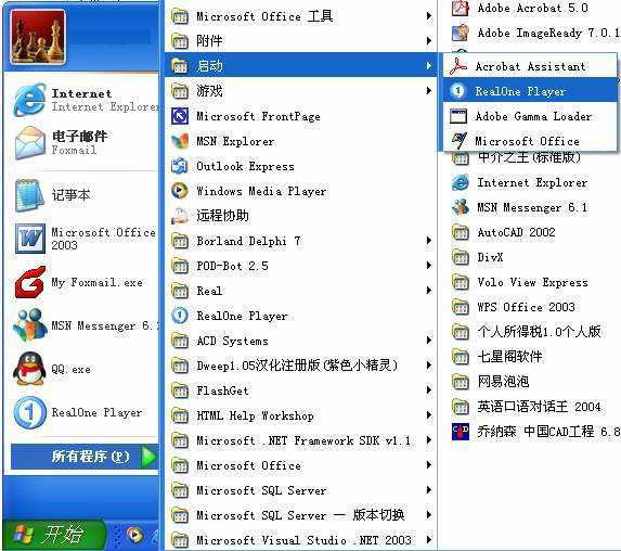 右击“开始”按钮,选择“资源管理器”,系统就会打开“资源管理器”并自动定位在“C:\Documents and Settings\用户名\「开始」菜单”文件夹。其中,“程序”文件夹就对应着“开始→所有程序”菜单。而“程序”文件夹中的“启动”文件夹就对应着启动菜单项。把程序的执行文件或者快捷方式复制到该文件夹中,即可实现该程序的自动加载。