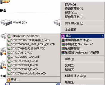 当安装此软件后,会在“虚拟光驱”、“*.vcd”文件的右键快捷菜单上增加一个“插入”快捷菜单(如图),方便虚拟光驱文件的插入,但是当“虚拟光驱”里已经有一张“虚拟光碟”时,比如“虚拟光驱”里有一张“mp3.vcd”文件,而你再在另一张虚拟光碟(比如 “mp3_2.vcd”文件)上单击右键,在弹出的快捷菜单上选择插入,这时会弹出一个对话框提示插入成功,也就是说插入了“mp3_2.vcd”这个文件,但是你到“我的电脑”下看看虚拟光驱里插入的并不是“mp3_2.vcd”这个文件,而是原来的“mp3.vcd”文件,也就是说软件在插入“mp3_2.vcd”时没有弹出“mp3.vcd”,也不会提示让你先把原虚拟光碟弹出来再进行插入操作,而是弹出一对话框说插入成功。