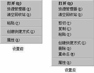 其中各组数据表示的含义是:00:打开,01:复制,02:剪切,03:复制和剪切,10:重命名,20:删除,30:重命名和删除,40:属性,50:重命名和属性,60:删除和属性,53:复制、剪切、重命名、属性,63:删除、属性、复制、剪切,73:重命名、删除、属性、复制、剪切。假如把数值Attributes的数据改为“73010020”,完成后重新启动计算机即修改成功,如图可以看到修改前后回收站快捷菜单对照情况。