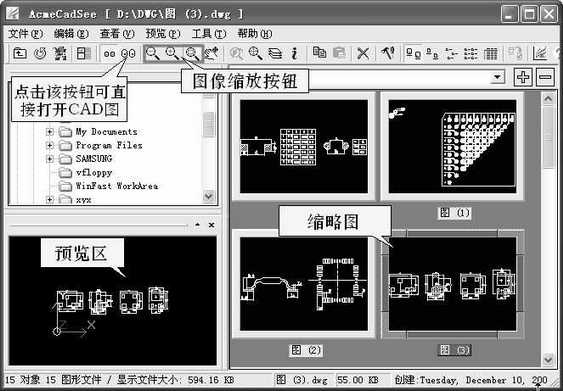 Acme CADSee是CAD图形文件的专用浏览器,它支持AutoCAD 2002以下版本的DWG和DXF文件。它的主界面和ACDSee非常相似,操作方式也几乎如出一辙。我们只要在左上方的文件夹列表中选择某个文件夹,在右侧窗口中就能看到以缩略图形式显示的CAD文件。如果觉得通过缩略图不容易确定要查找的文件,可以在左下方的预览区内对选中的文件进行预览(图1)。