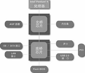 随着各种主板新技术的出现,芯片组采用的技术有了非常大的变化和发展。从当今的微机结构来看,所有的信息交换都是通过主板芯片组完成的,而CPU甚至可以被看做是主板芯片组的一个“外部设备”。这一点可以通过主板逻辑架构图看出──在主板架构中,北桥芯片和南桥芯片是所有硬件设备进行通信及沟通的桥梁,而北桥芯片也和南桥芯片分别控制了一些外围设备(图1)。