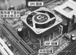 首先来看北桥芯片,该芯片一般位于CPU插座与AGP插槽的中间,其芯片体型较大,加上其工作强度高,发热量也很可观,因此一般在该芯片的上面,还覆盖有一个散热片或者散热风扇(图2)。